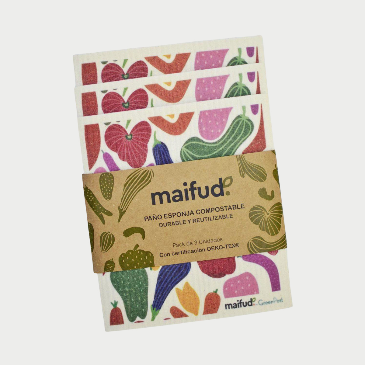 - Pack de 3 unidades con ilustraciones de frutas y verduras "imperfectas"