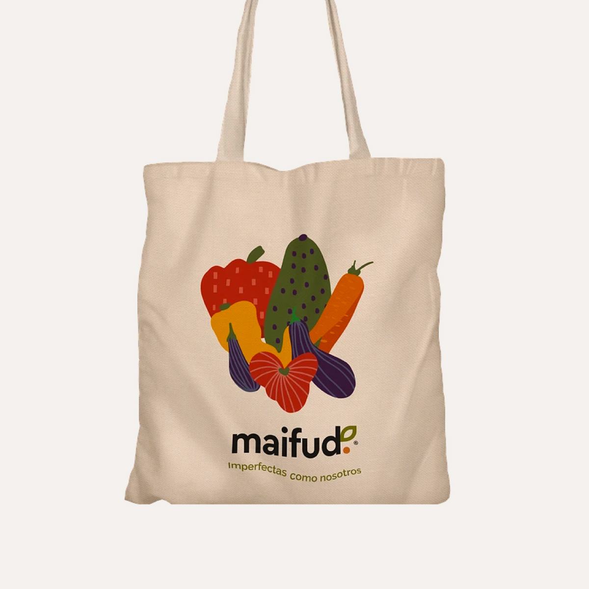 Evita las bolsas plásticas con este lindo bolso de tela, reutilizable Maifud con ilustraciones de frutas y verduras "imperfectas" hechas por Paula Goeppinger.